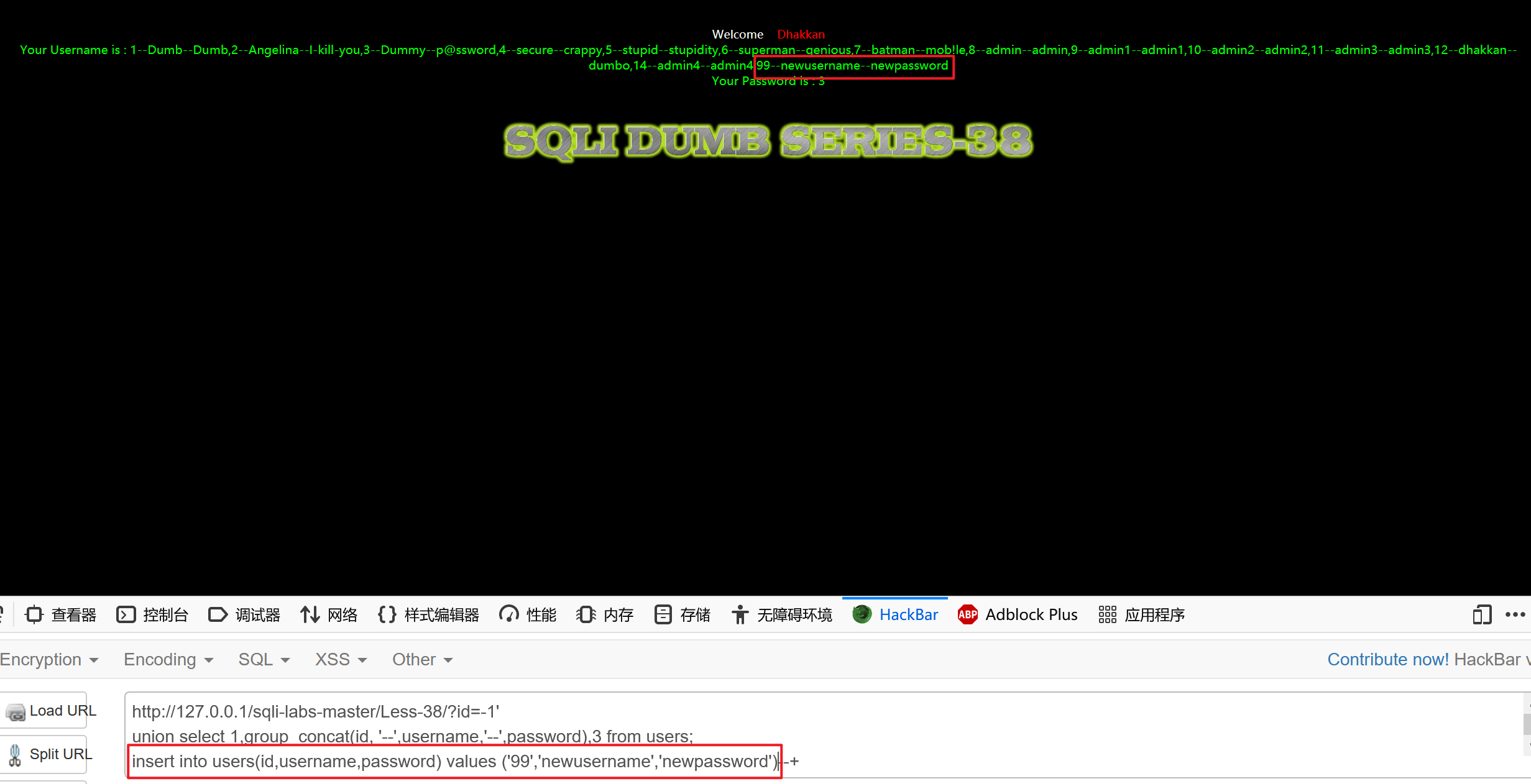 1 | insert into users(id,username,password) values ('99','newusername','newpassword') |